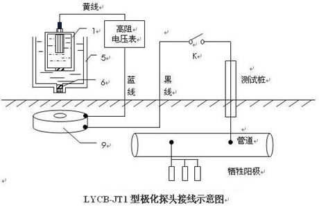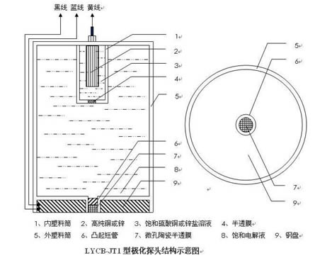 Ⅱ、通過鹽橋孔 6 由筒 1 內置的銅/硫酸銅或鋅參比電極就可以很容易地用高阻電壓表測出鋼盤(也是地埋管道)的極化電位。由于鹽橋孔 6 的管壁很薄,半透膜微孔陶瓷與鋼盤距離很近則由此引起的 IR 降極小,在工程上完全可以忽略不計,即所測出的電極電位就是管道上真實的極化電位。在電化學實驗室為了準確測量電極電位,通常要使用一支帶有魯金毛細管的鹽橋,以期使參比電極盡量靠近研究電極,從而消除 IR 降使電位測量盡可能真實。同樣 LYCB-JT1 極化探頭其鹽橋孔 6 與鋼盤 9 之間的距離(塑料管壁)也很小,僅為數毫米。實際就是工程上的“魯金毛細管”,從而使 LYCB-JT1 極化探頭能有效地抑制 IR 降。